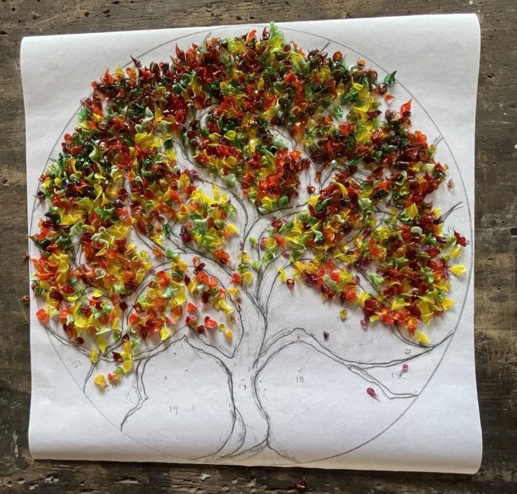 This also gives us some idea of how the window will look in reflected light. Often, we will attach some of the leaves to a piece of the background glass to see how the colors look in daylight.