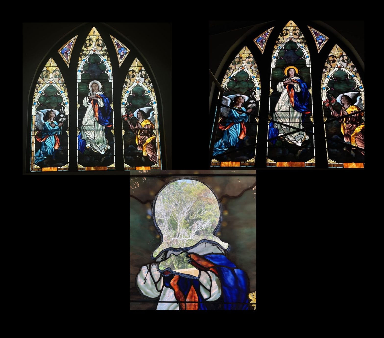 They had purchased a stained-glass window, probably made in the 1950s, that they wanted to install above the altar. After lifting it into place for the first time, they noticed Mary’s face and hands were not up to the aesthetic level of the rest of the window. They later learned the original face and hands had been removed and replaced by a lesser artist.