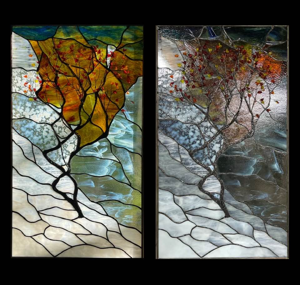 This window is part of a series depicting the four seasons for a home North of Washington, DC. I created the series in 2020. I start with an idea sketch to find the glass for such a window, wanting to remain as flexible as possible while searching. This invariably means a trip to my favorite glass factory, Youghiogheny Opalescent Glass Company, in Connellsville, Penn. Their production is in the back of their complex, attached to a large warehouse in front full of rows of crates of stained glass stacked one row on top of the other. Each glass crate
